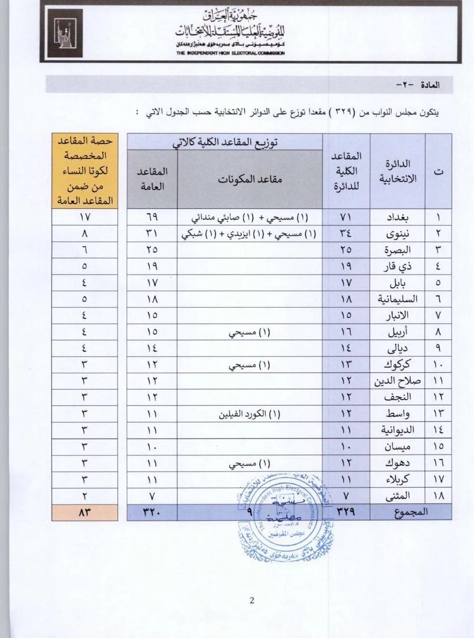 وكانت المفوضية العليا للانتخابات العراقية، أعلنت الأربعاء الماضي، النتائج الأولية للانتخابات البرلمانية، التي شهدت إقبالاً بنسبة 56.11% لاختيار 329 نائباً.