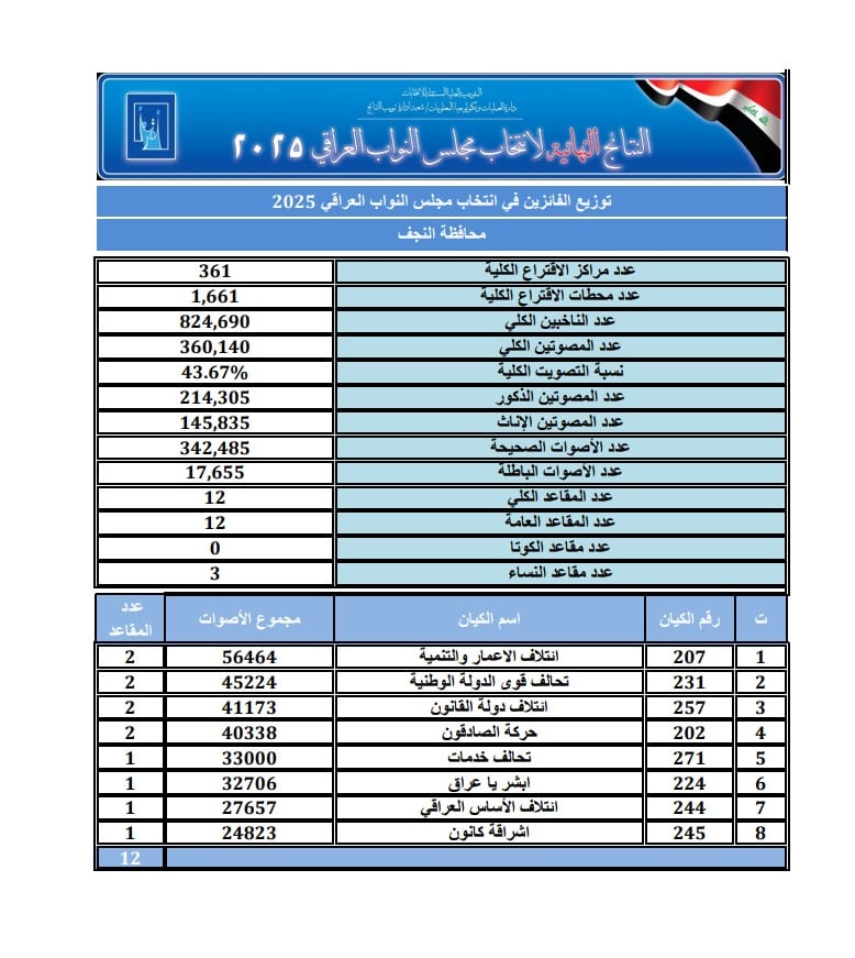 أعلنت المفوضية العليا للانتخابات، اليوم الاثنين، نتائج الانتخابات التشريعية النهائية لمحافظة النجف..