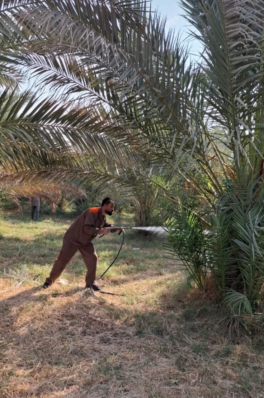 وتابع ان "العام الجاري شهد تسجيل (5) اصابات في ناحية "الطف"، وقبل ايام قليلة سجلت اصابتين في منطقة "ابو جدر" التابعة لناحية الخيرات والمحاذية لقضاء الكفل في محافظة بابل عن طريق ابلاغ وردنا من المزارع، واتخذت على الفور الاجراءات اللازمة لمكافحتها، ويتكون برتوكول المعالجة للنخلة القائمة التي لم تكسر ويمنع منعا بابتا قطعها او حرقها من عدة خطوات ينفذها الموظف الفني المختص والمدرب على وقاية المزروعات وتبدأ بتنظيف مكان الاصابة وتبخيرها بأقراص "فوسفيد الالمنيوم"، واغلاق الفتحة التي احدثتها الحشرة بمادة الطين بشكل محكم، ثم حقنا بمبيدات خاصة بهذا المجال، ثم رش النخلة من الرأس الى الجذع بمبيدات بتراكيز محددة ضمن البروتوكول، وبعدها يتم تعفير النخلة بمادة الكبريت للأمكنة التي ازيل الكرب منه، حيث تماثلت جميع النخلات التي تمت مكافحتها عام (2024) للشفاء وحملت بالتمر هذا العام، اما بالنسبة للنخلة المكسورة الميتة، فنقوم بتقطيعها ومعالجتها بالمبيدات واخراج الحشرات منها وقتلها، وهناك مخاطر على المعالجين وخاصة من اقراص الفوسفيد كونها مادة سامة وخطرة جدا، لذلك منتسبينا على دراية تامة بهذه الخطورة ورغم ذلك يتفانون في اداء واجباتهم، والاصابات هذا العام لغاية اليوم بلغت (11) نخلة في جميع اقضية ونواحي المحافظة، بينما دخلت عدد من المحافظات مثل ديالى وواسط مرحلة انتشار سوسة النخيل الاحمر، لان اغلب فلاحي كربلاء تفاعلوا مع حملات التوعية الواسعة وهم متعاونون مع مديريتنا وحريصون على بساتينهم، محذرا الجميع من آفة سوسة النخيل الحمراء التي لا تبقي ولا تذر، داعيا اي شخص يشاهد الاعراض بالاتصال والابلاغ عنها ويجد جميع الاجراءات المجانية تحت تصرفه لحماية بستانه او حديقته".