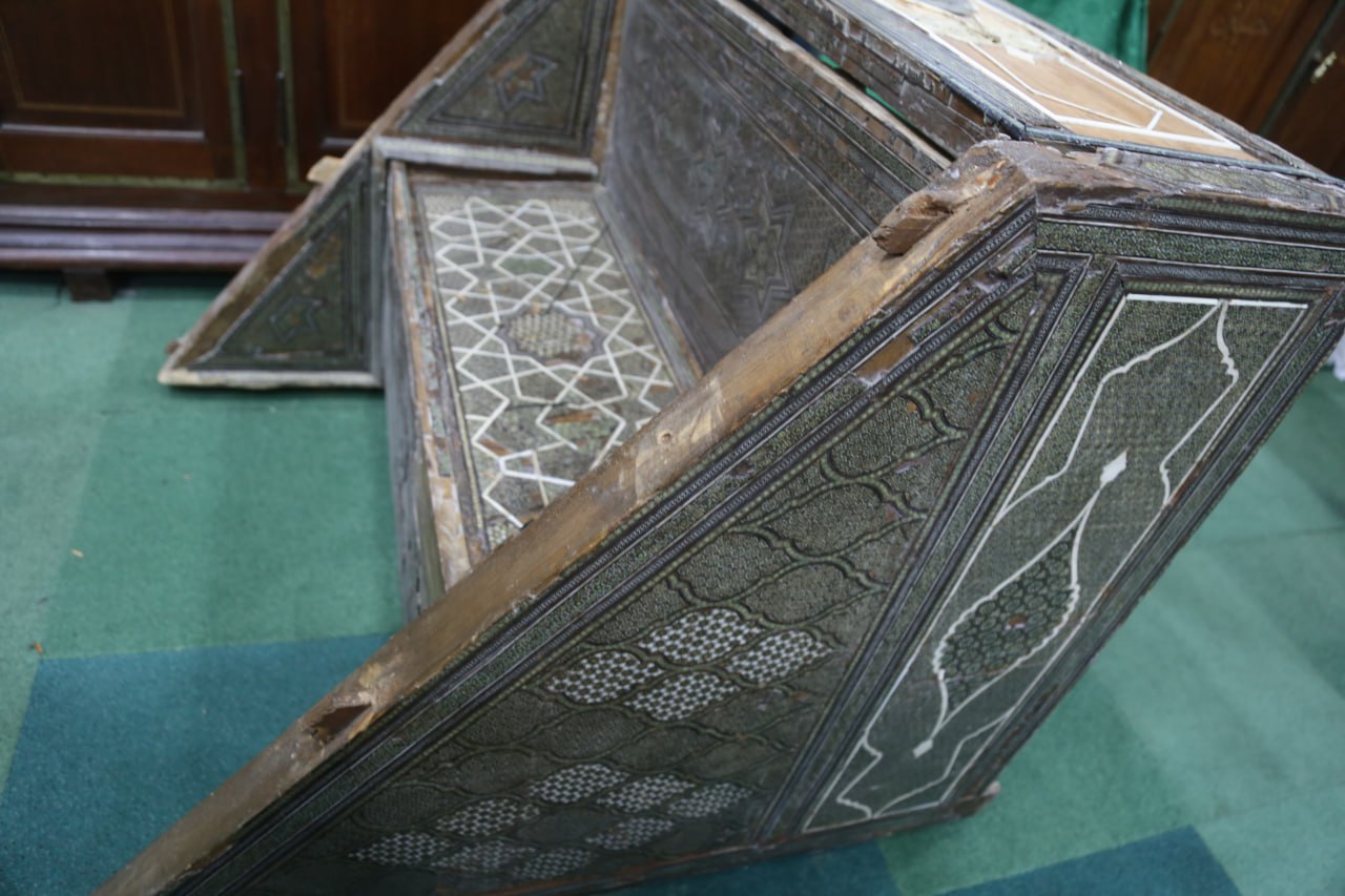 وقال مسؤول شعبة الصيانة والترميم داخل حرم الامام الحسين (عليه السلام) "حسنين رحمن عبد الله" في تصريح لوكالة نون الخبرية ان "العمل بدأ بجمع المقتنيات التي تخص متحف الامام الحسين (عليه السلام) في بداية تأسيسه في العام (2009)، وعثرنا على قطع خشبية في مواقع عدة لم نعرف حينها الى اي شيء تعود وكانت توقعاتنا انها تعود الى الصندوق الخشبي للقبر الشريف كونها تمتاز بفن يسمى "فن الخاتم" وقد سمي بهذا الاسم كونه خاتم لجميع الفنون، الذي يدخل بصناعته حوالي (7) انواع من الاخشاب بالوان طبيعية، كما يدخل بصناعته معادن الفضة والذهب من القطع الثمينة"، مستدركا بالقول "لكن الآن ومع الحداثة التي طرأت استبدلت هذه القطع بالألمنيوم وغيرها من المعادن، وبعد ان جمعنا جميع القطع الخشبية في العام (2011)، وجدنا انها عبارة عن منبر خطابة يعود تاريخه الى حوالي (185) عاما ميلاديا، واهدي الى مرقد الامام الحسين (عليه السلام) من قبل رئيس وزراء الدولة القاجارية "الميرزا ابو الحسن خان" حيث كتب اسمه اعلى المنبر، وقد بحثنا عن هذا الاسم ووجدنا انه بالفعل رئيس الوزراء حينها، ومن المؤسف اننا عندما بدأنا بترميم هذه القطع وجدناها تضررت بشكل كبير نتيجة الرطوبة وغيرها، بسبب الخزن غير الصحيح لعدم معرفة من خزنها بقيمتها"، مشيرا بالقول" لكننا بعد ان انتظمنا في دورات تدريبية عالية المستوى في المتحف العراقي، تمكنا من تقليل الضرر الحاصل الى ادنى حد باستخدام المادة اللاصقة "الغراء".