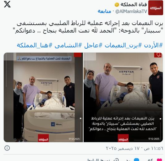 وأجرى يزن النعيمات العملية الجراحية في منتجع اسبيتار الطبي بالعاصمة القطرية الدوحة، تحت إشراف أحد أكبر المتخصصين في جراحات الرباط الصليبي في العالم وتمت بنجاح.