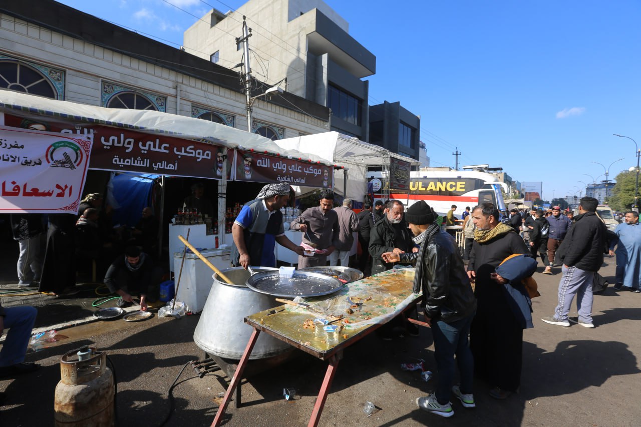 لا ينفك يعطي التوجيهات لخدام الموكب وهو جالس معنا ويتحدث عن موكبهم الذي يمثل احد بيوتات قضاء الشامية المشهورة بالخدمة الحسينية ويقول كفيل موكب "علي ولي الله" "خالد مشكور ابو عبيه" لوكالة نون الخبرية ان" الخدمة الحسينية تعلمناها من آبائنا واجدادنا فكنا نراهم في زمن النظام المقبور يتكلمون بالمنع والحيطة والحذر الا انهم يطبخون ويوزعون الطعام ويذهبون سرا مشيا على الاقدام الى كربلاء المقدسة في الاربعينية، وكنا ننتظر حلول شهر محرم الحرام حيث تعودنا على ان تلبسنا امهاتنا الملابس السوداء ويصحبوننا الى المجالس وكانت مدينة الشامية تكتسي بالسواد والحزن والنعي والبكاء من اقصاها الى اقصاها لان اهلها جميعهم حسينيون، وكانت في الايام الثلاثة عشر الاولى من شهر محرم تشهد مواكبها وحسينياتها ومساجدها يوميا محاضرة دينية ومجلس عزاء ووجبة طعام للمعزين، اما في ايام الاربعينية فكانوا يتهيؤون للسير الى كربلاء المقدسة ويأخذون الطعام معهم لعدم وجود مواكب خدمة حسينية في تلك السنين السابقة، وليس كما نراه الآن من مواكب متراصة من البصرة الى كربلاء المقدسة، وكذلك باقي المحافظات، ويتخذون الحذر الشديد في سيرهم بالبساتين ليلا ويقطعون بعض المسافات سباحة في الانهر بعيدا عن عيون ازلام النظام المقبور، وحالهم حال من طلب رأسه للثأر خائف ومرعوب لكنه يتحدى الظالمين ويصر على احياء شعائر الحسين (عليه السلام) وهو ما زرع في انفسنا كل هذا الحب والبذل والعطاء".
