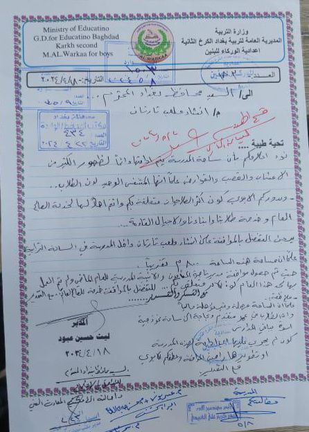 واضاف قائلا ان" الامور عندما توقفت امام حاجز عدم وجود التخصيصات المالية توجهنا لنطرق ابواب اخرى سعيا من الادارة لترميم بناية المدرسة فكان مراجعتنا هذه المرة الى محافظة بغداد واستحصلنا موافقة بجهود شخصية بمساعدة ولي امر احد طلبتنا ويعمل مهندسا في المحافظة، وتعاون معنا في متابعة اي كتاب يخص طلبنا واي موافقة يحتاجها، حتى تمكنا من استحصال موافقة محافظة بغداد شخصيا على مشروعين الاول يتضمن انشاء ملعب خماسي "تارتان" في ساحة المدرسة الترابية لكي يكون متنفسا للطلاب من جهة ويمكنهم ممارسة الرياضة في ساحة نظامية بمواصفات عالمية، وكذلك انجاز اعمال الصيانة والترميم لأي اضرار في المدرسة وفي مقدمتها السياج الخارجي المهدم ضمن مبادرة رئيس مجلس الوزراء "محمـد شياع السوداني"، ولكن فوجئنا ان احدى الموظفات المسؤولات ادرجت مدرستنا في جداول المشاريع التي سيتم تأهيلها بالتتابع وحسب الاوقات المحددة وليس استثناءً او افضلية كما اشار اليه هامش محافظ بغداد"، مؤكدا ان" ادارة المدرسة ابلغت التربية بأن باقي اجزاء السياج الخارجي آيلة للسقوط، وكما توقعنا فقد سقط جزء آخر منه قبل ايام وباقي الاجزاء على وشك السقوط، وكذلك جزء علوي من سقف المدرسة آيل للسقوط تساقط جزء منه، وهو امر سيعرض الطلبة للخطر او لدخول الكلاب السائبة التي انتشرت كظاهرة في كثير من المحافظات ومنها العاصمة بغداد والكل على اطلاع بما فعلته تلك الكلاب بالاطفال او الناس، بالرغم من ان المدرسة اتخذت تدابير مهمة في تواجد المدرسين خلال الفرص بين الدروس ودرس الرياضة في الساحة والتعاون مع الاهالي الذين تحيط بيوتهم بالمدرسة على عدم السماح لاي احد بالدخول الى بنايتها، لكن الخطر يبقى قائم".