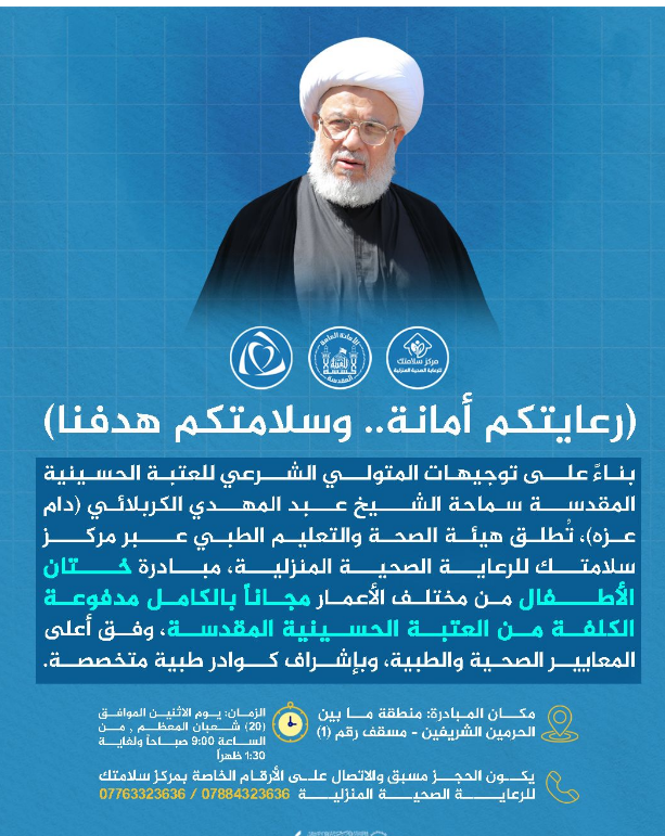 أعلنت هيئة الصحة والتعليم الطبي، عبر مركز «سلامتك» للرعاية الصحية المنزلية، والتابع للعتبة الحسينية المقدسة إطلاق مبادرة إنسانية بعنوان «رعايتكم امانة .. و سلامتكم هدفنا »، وذلك استنادًا إلى توجيهات المتولي الشرعي للعتبة الحسينية المقدسة، سماحة الشيخ عبد المهدي الكربلائي (دام عزه).