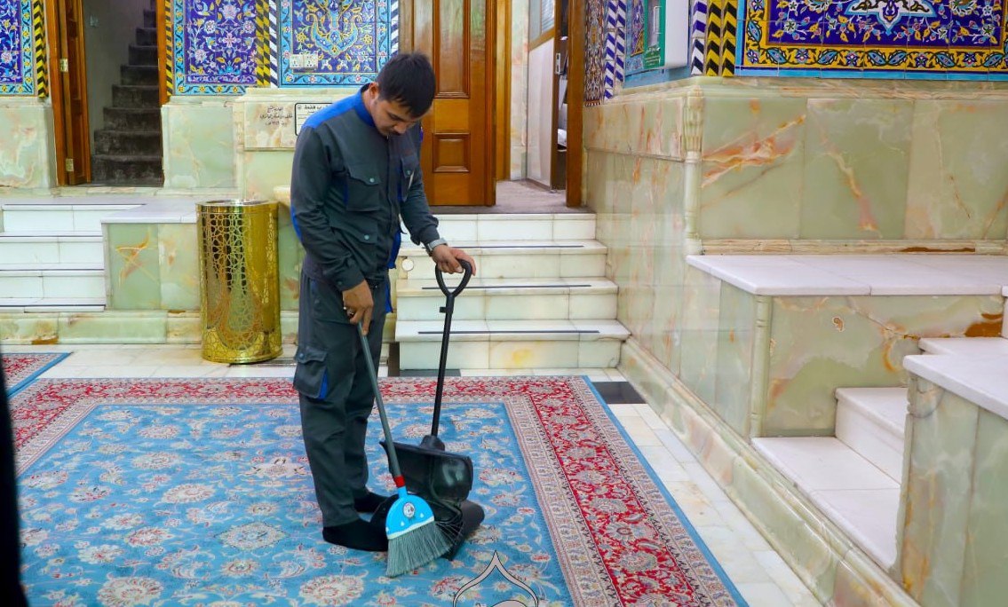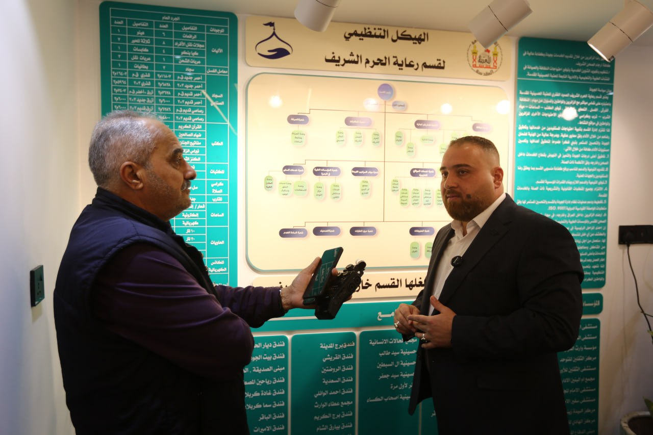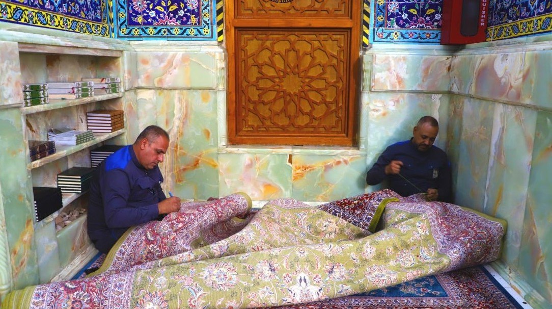 مهام مهمة اخرى يتحدث عنها "الحمداني" قائلا ان" شعبة المفروشات في القسم مختصة بفرش ورفع السجاد (الزوالي) المتسخ والذي تقع عليه النجاسات مثل الدماء، وريافة السجاد ومعالجة المتمزق منها، وكل سجادة (زولية) فيها رقم خاص ولدى الشعبة نظامين ورقي والكتروني تذكر فيه معلومات السجادة مثل متى دخلت الى الخدمة؟ وهل ما زالت او رفعت؟ وكم مرة ارسلت للغسل؟ ومكان فرشها في الصحن الشريف او الحرم، وهل خرجت من الخدمة ام ما زالت فيها؟، وهو توثيق دقيق لرحلة السجادة، ومهمة المنتسبين رسم امكنة الزوالي اشبه ما يكون بالتصميم الهندسي، ولدى الشعبة ورشة متكاملة يعمل فيها روافين متخصصين ماهرين يعيدون الممزق الى جديد، وكذلك من مسؤوليتهم الكاربت الذي يفرش في العاشر من المحرم وفرش الزيارات المليونية، اما شعبة السراديب فهي على حد تعبيره "صحن ثاني تحت الارض"، وفيها الفرش، وحاويات النفايات، وكراسي الصلاة، ومراقبة السلالم الكهربائية، حيث يمنع المنتسبون الاطفال من العبث بالسلالم الكهربائية حفاظا عليهم، ومنع الصبيان البالغين المميزين من الدخول الى سراديب النساء للحفاظ على خصوصيتهن، وتهيئة امكنة صلوات الجماعة، وتتكفل الشعبة بالنظافة والفرش والرعاية وتوفير ماء الشرب، وتوفير الاجواء المناسبة في السراديب لطلبة السادس الاعدادي كل عام للتحضير للامتحانات".