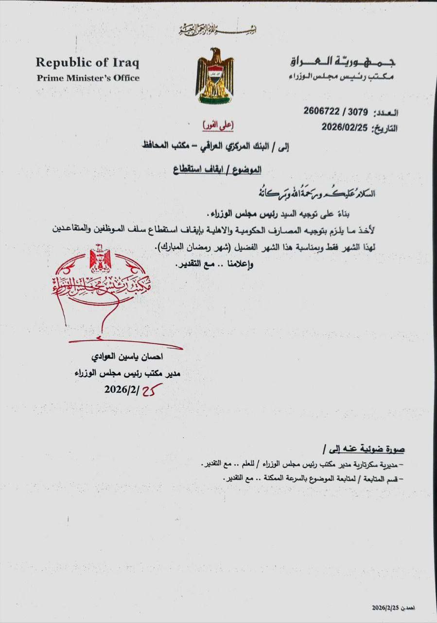أصدر مكتب رئيس مجلس الوزراء، اليوم الخميس ، توجيهًا عاجلًا إلى البنك المركزي العراقي، يقضي بإيقاف استقطاع سلف الموظفين والمتقاعدين من المصارف الحكومية والأهلية لشهر فبراير الحالي، بمناسبة حلول شهر رمضان المبارك