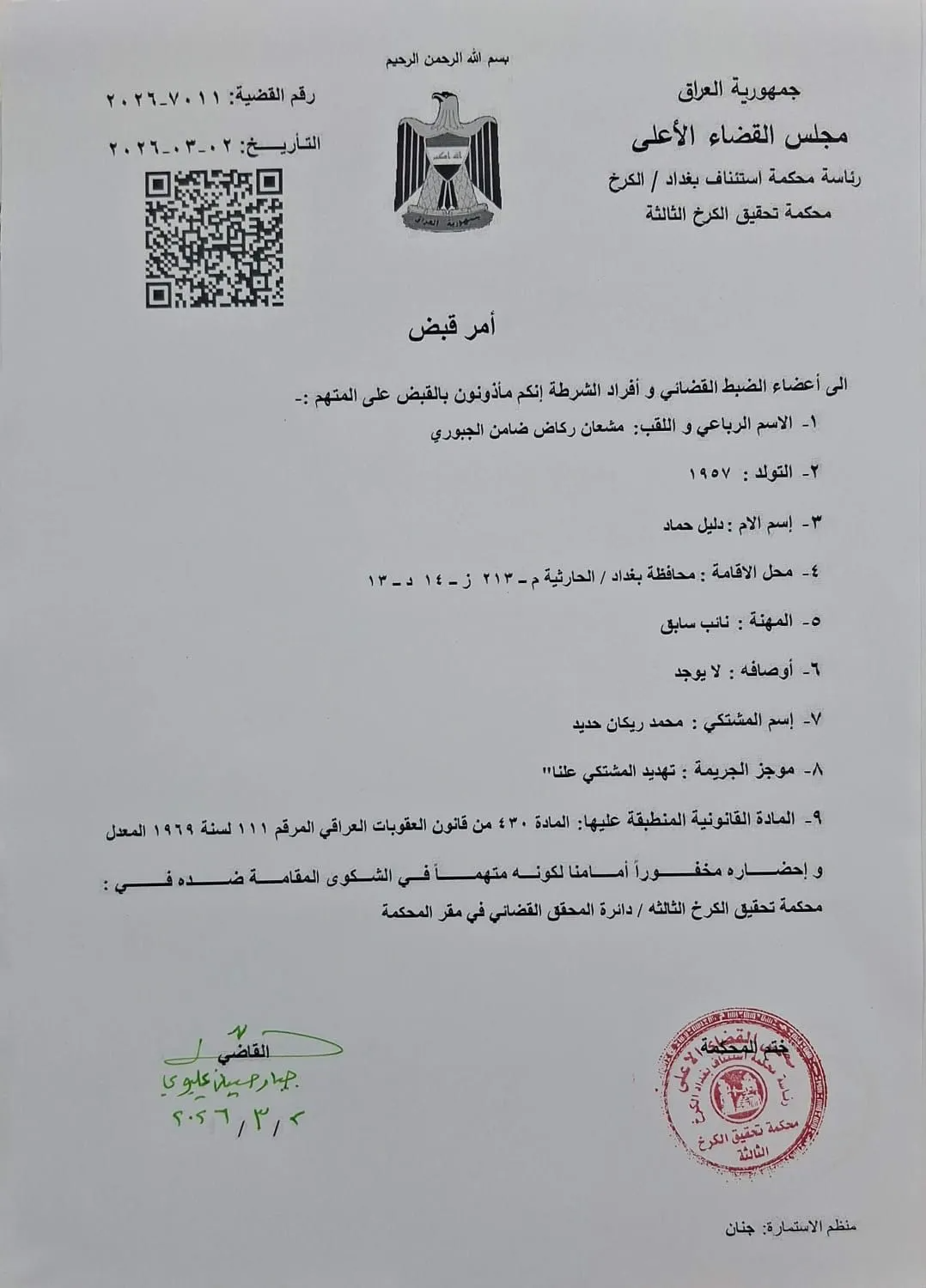 وأشارت وثيقة صادرة بتاريخ 2 آذار الجاري، وحصلت عليها وكالة نون الخبرية، إلى أن "رئاسة محكمة استئناف بغداد – الكرخ / محكمة تحقيق الكرخ الثالثة، وجّهت أعضاء الضبط القضائي وأفراد الشرطة بالقبض الجبوري، ومحل إقامته في بغداد، بتهمة تهديد المشتكي علناً".