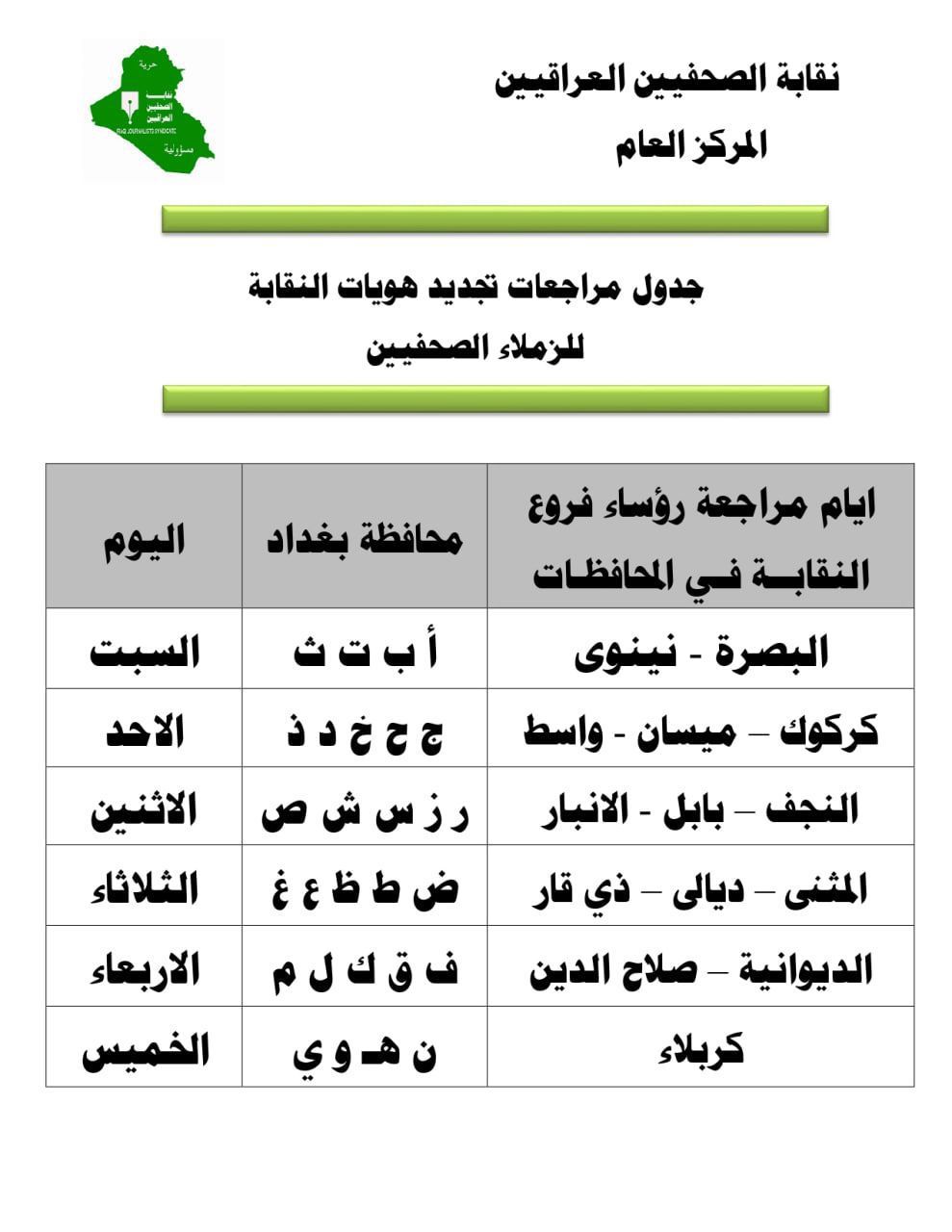 واوضح بيان للنقابة اليوم انها اعدت جدولا بأيام مراجعة الصحفيين من سكنة محافظة بغداد لغرض تسهيل الاجراءات وحسب الاستمارة المعدة لهذا الغرض على ان ترفق بكتاب تاييد من المؤسسة الاعلامية التي يعمل فيها الصحفي والمعتمدة في النقابة واسمه ضمن ملاك المؤسسة ويستثنى من كتاب التاييد الصحفيين الرواد وفيما يخص رفع ترقين القيود فتنطبق عليهم الضوابط المذكورة اعلاه .