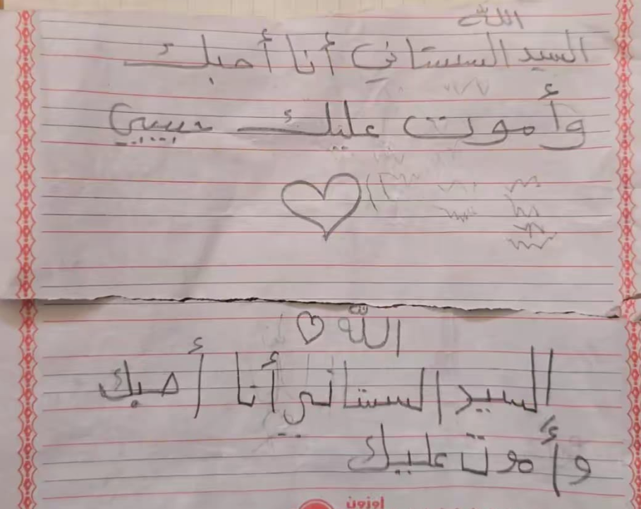 تنشر وكالة نون الخبرية مجموعة رسائل لاطفال هبـّوا لاغاثة الشعبين اللبناني والايراني حيث تبرعوا بمصروفهم المدخر تلبية لنداء المرجعية العليا بالنجف الاشرف وكتبوا رسائل عفوية الى سماحة المرجع الاعلى عبروا بها عن تضامنهم مع نداء سماحته في دعم الشعبين اللبناني والايراني المظلومين