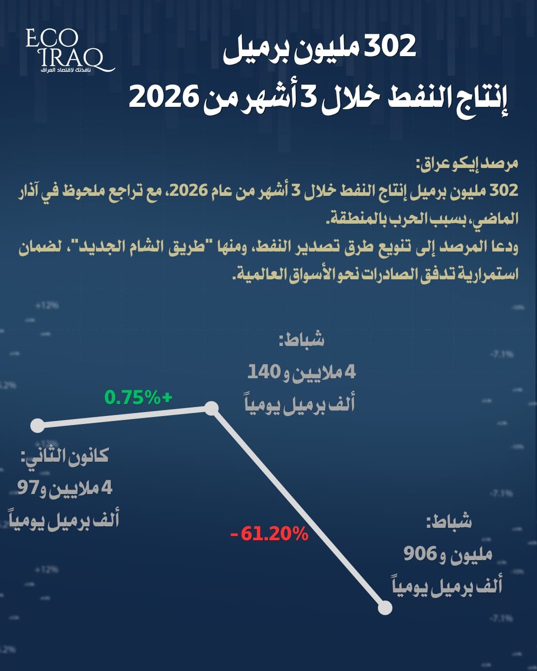 أعلن مرصد إيكو عراق، اليوم الاحد، بيانات إنتاج النفط العراقي خلال الأشهر الثلاثة الأولى من عام 2026، فيما دعا المرصد لتنويع تصدير النفط وعدم الاكتفاء بالخليج، ومن البدائل "طريق الشام الجديد".