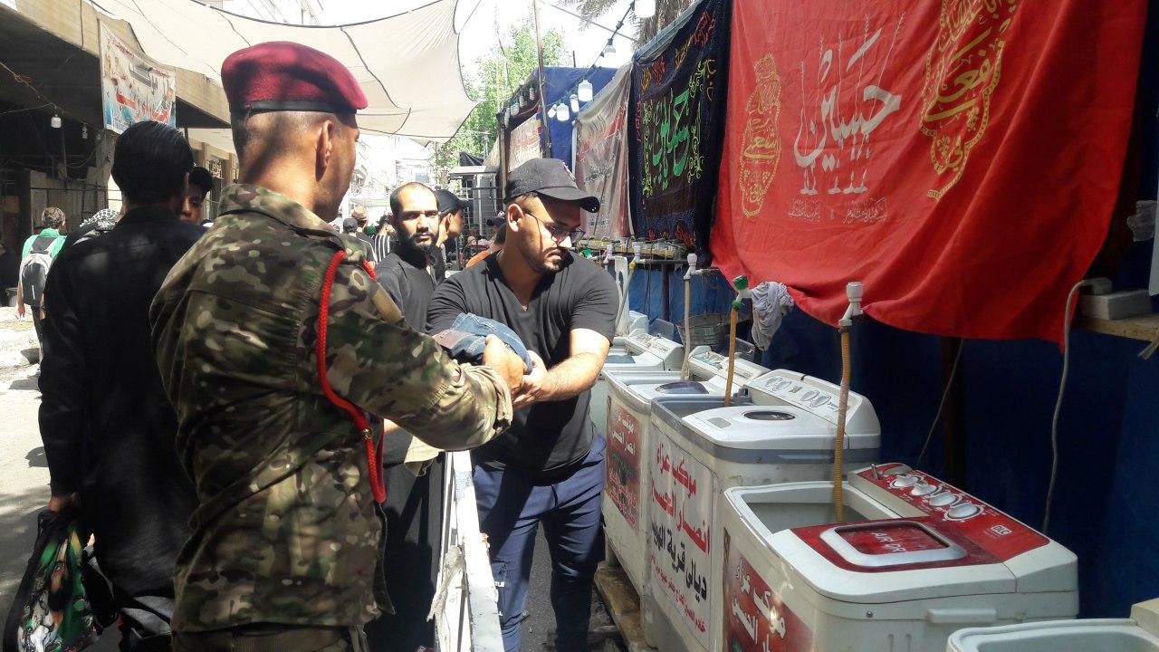 عندما وقع نظري على مجموعة الغسالات المتراصة مع بعضها على رصيف احد شوارع المدينة القديمة في كربلاء المقدسة، ظننت انه محل لتصليح الغسالات، لاسيما انه يقع داخل زقاق ضيق وقديم، ثم دققت النظر فوجدت ان هناك يافطة مكتوب عليها، موكب انصار الحسين (عليه السلام) لاهالي منطقة هويدر في محافظة ديالى، فاشتـبه عليّ الامر، وبعد لحظات واذا بأحد خدام الموكب يتسلم ملابسا من زبائن بينهم رجال ونساء ويضعها في غسالاته الممتدة لمسافة تتجاوز العشرة امتار ويقوم بغسلها، فسألت الشاب غزوان احمد الذي تسلم ملابسه توا بعد غسلها عن هذا المكان، فاجاب هذا "رحمه من الله" اني والاف مثلي عندما نمشي من محافظاتنا الى كربلاء المقدسة نتعرق وتتلوث ملابسنا بالاتربة والاطيان وتصبح رائحتها كريهة، فضلا عن ما يلحق بالجلد من تقرحات نتيجة تعرق الملابس، واكثر المواكب الحسينية هي خيم وحتى المواكب المبنية لا توفر هذه الخدمة، لذلك يصعب علينا دائما غسل ملابسنا لانها لا تجف وخصوصا في فصل الشتاء، اما هذا الموكب فهو المعين لنا في اداء شعائرنا بنوع من الراحة، اذ تعرفت عليه قبل خمسة اعوام واصبحت زبون دائم له، وتشاطره اخته شيماء احمد بالقول "نحن النساء نعتبر عمل هذا الموكب مفيدا جدا لنا لان المرأة لا تستطيع الحركة بحرية حتى داخل امكنة المبيت التي توفرها المواكب الحسينية لانها دئما داخل خيم او حسينيات وحتى لو غسلنا ملابسنا فيصعب علينا نشرها او تجفيفها وهذا الموكب يقدم تلك الخدمات فيساعد النساء وبالذات ممن اصطحبن اطفالهن الى الزيارة الاربعينية على غسل الملابس والشعور بالراحة والاستمرار بأداء الشعائر واتمام الزيارة.