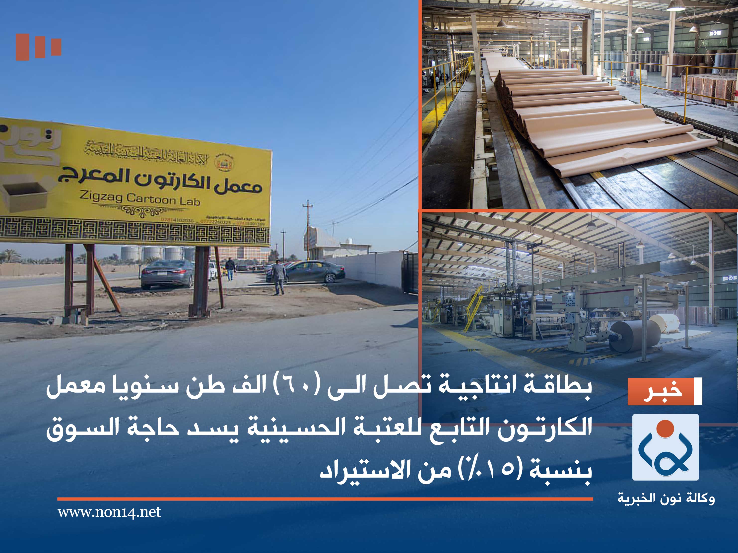 ولمعرفة المزيد وكالة نون الخبرية التقت مع مسؤول ادارة معمل الكارتون المُعرج في العتبة الحسينية المقدسة الاستاذ نور عبد الزهرة عبد الرسول قائلا: معمل الكارتون المعرج التابع لشركة خيرات السبطين في العتبة الحسينية المقدسة حيث يقع على مساحة (17) دونم والمساحة المشغولة للإنتاج والمخازن هي (5) دونم والمساحة الباقية هي للإدارة والخدمات ومركز البيع المباشر، يتكون المعمل من خط انتاج معرج الماني الصنع ماركة phs)) بعرض (250سم) وبطاقة انتاجية سنوية تصل الى ما يقرب (60,000) طن منتج تام.