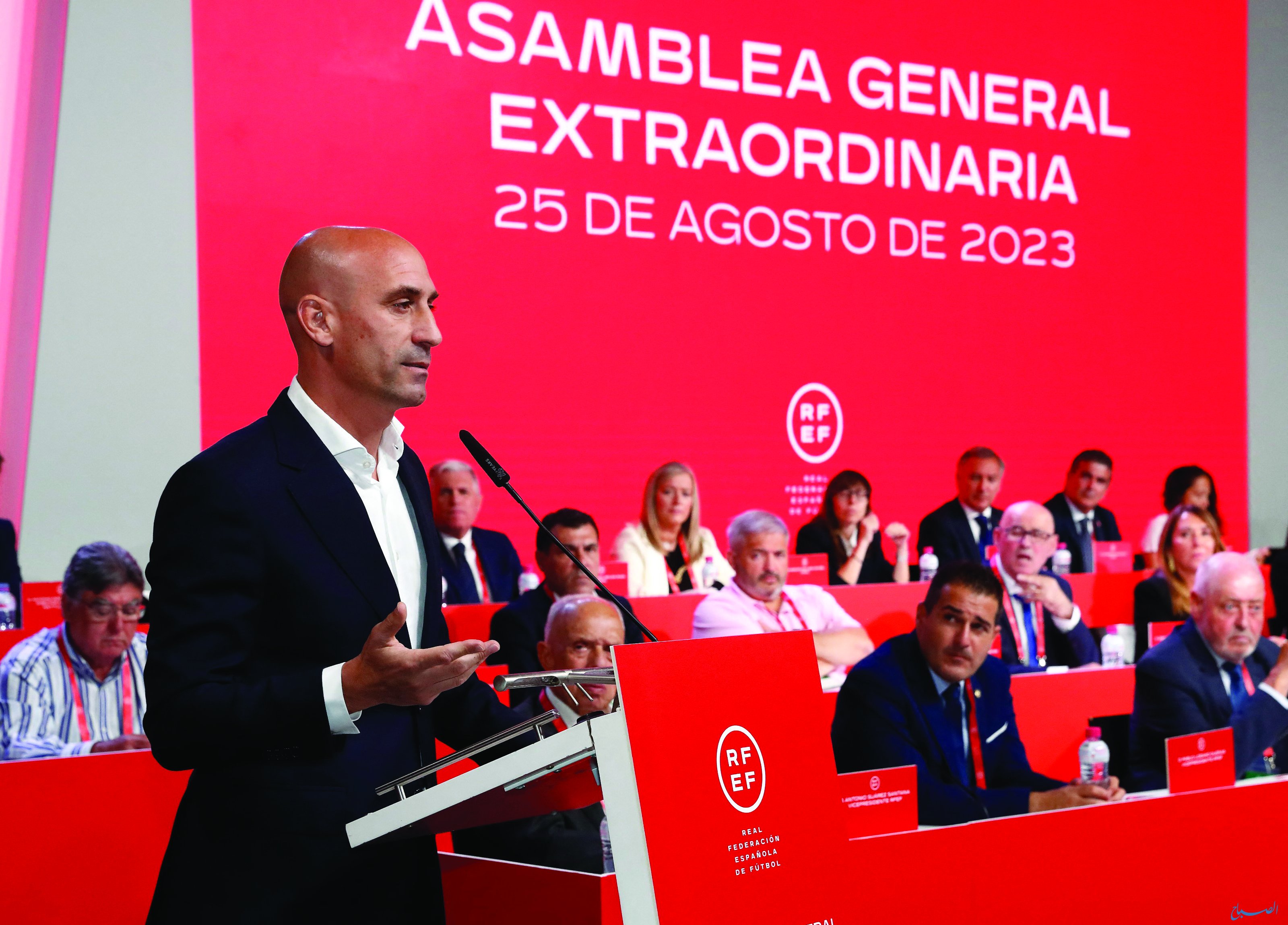 تَقدم رئيس الاتحاد الإسباني لكرة لويس روبياليس باعتذاره عن تقبيل إحدى لاعبات المنتخب الوطني للسيدات خلال الاحتفال بلقب مونديال 2023 لكنه رفض الاستقالة من منصبه وتعهد بمواصلة القتال ضد محاولة "اغتيالي علناً"، وذلك خلال الجمعية العمومية للهيئة الكروية في مدريد. أمس الجمعة