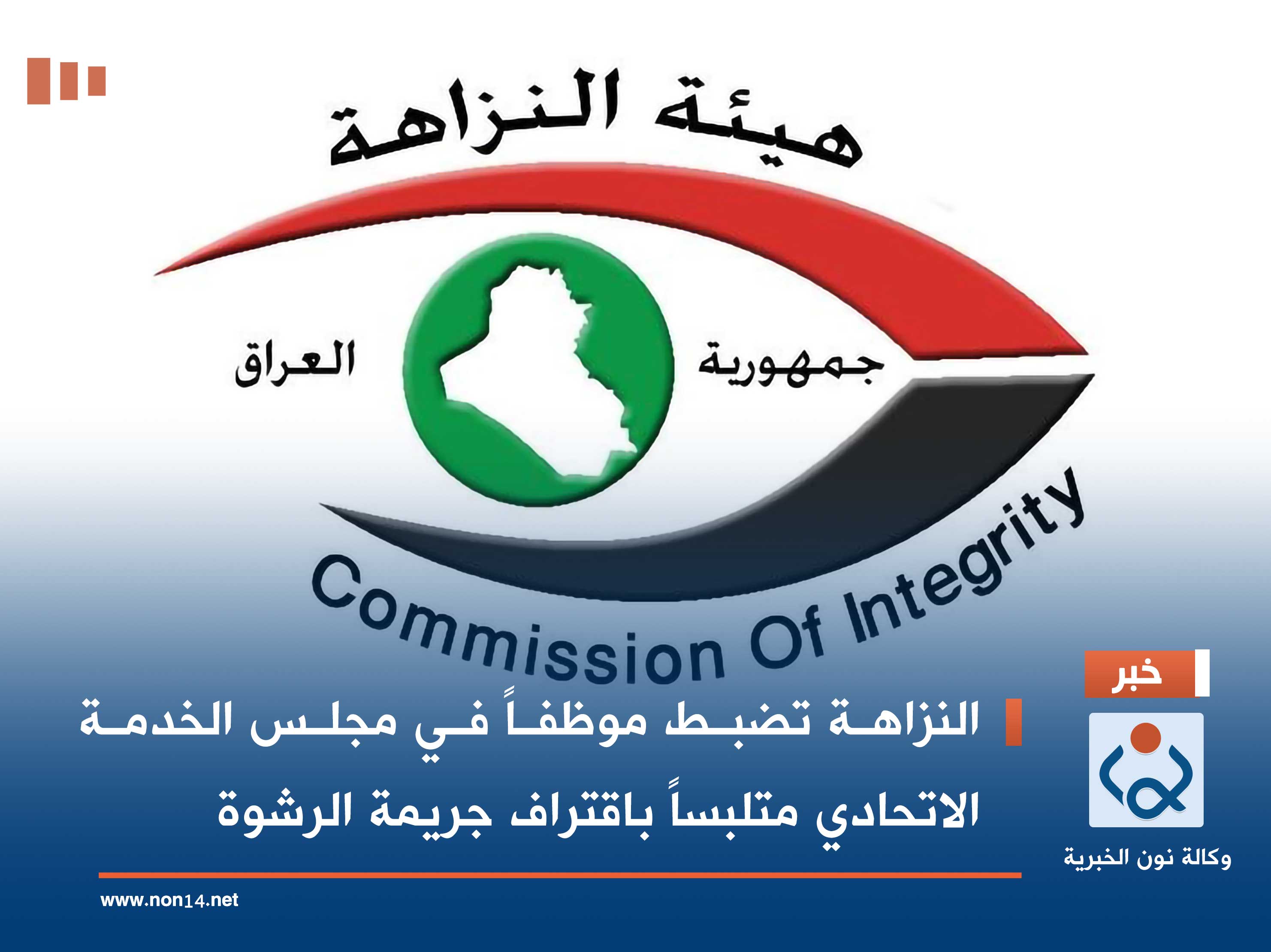 أعلنت هيئة النزاهة الاتحاديَّة، اليوم الأربعاء، عن ضبط موظفاً في مجلس الخدمة الاتحادي متلبساً باقتراف جريمة الرشوة.
