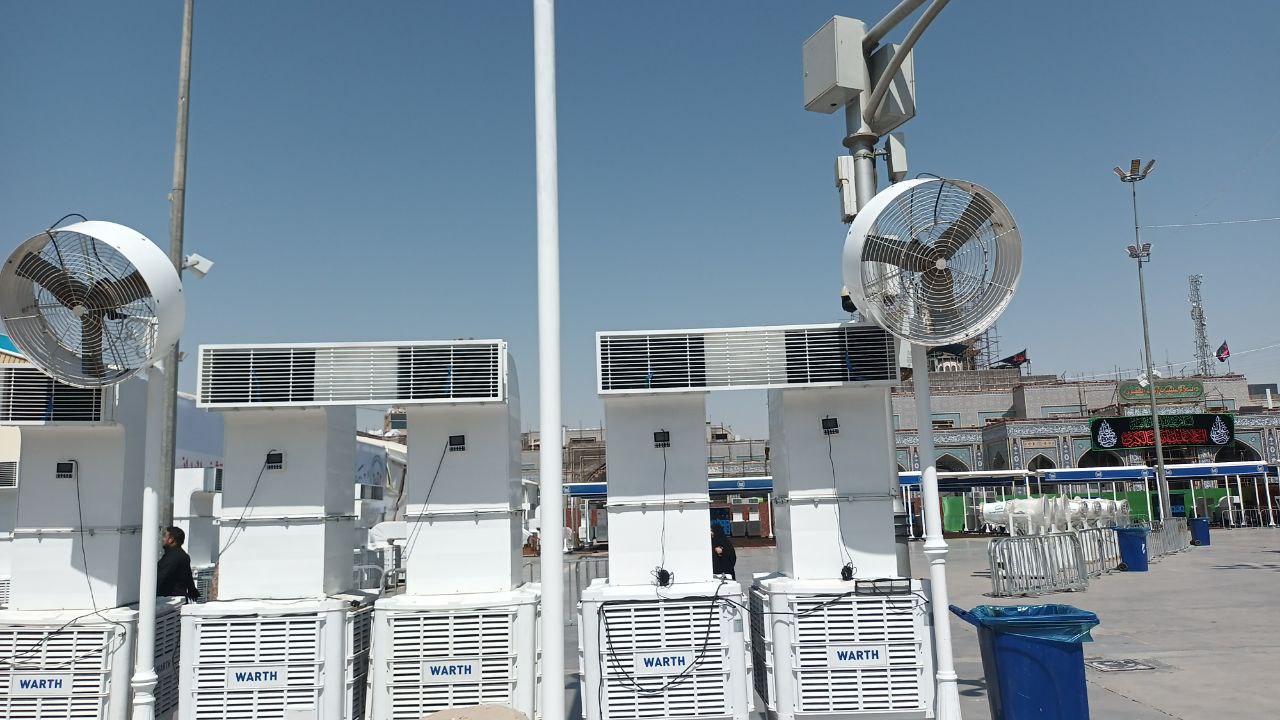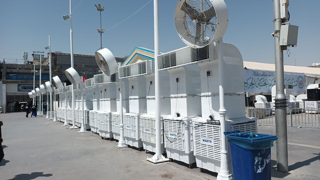 واوضح ان" تكييف باب القبلة تمكنا من تأمينه بسعة (2500) طن مكونة من منظومات متعددة، لان تكييف الفضاءات الخارجية التي تتنوع منظوماتها يختلف عن الداخلية، مثل مبردات الهواء المطورة المزدوجة التي نشر منها (210) مبردة منها مع مراعاة مسارات الركضة وتحديدها لتقليل الزخم، وتبدأ خطتنا في تأمين الاجواء الباردة والنقية والصحية للزائرين من شارع الجمهورية من عارضة مرقد ابي الفضل العباس باتجاه عارضة ابي عبد الله الحسين (عليهما السلام) نزولا الى ابواب الصحن الحسيني الشريف، وكذلك نصبت منظومات مراوح الرذاذ التي تضمنت نشر (64) مروحة رذاذ، اضافة الى بصمات الظل الجديدة التي نصبت بأعمدة حديثة وطراز وديكور معماري وجاري العمل باكمالها، ومعها اعمدة مزودة بمنظومة ضباب بطريقة علمية حديثة ( (SLOP DOWN